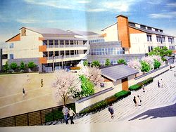 校舎は敷地の東半分に建設され3階建て、運動場は西半分を使い、正方形に近い形になります。(人工芝は検討しましたが、採用せず)完成予定は平成17年度末になります。